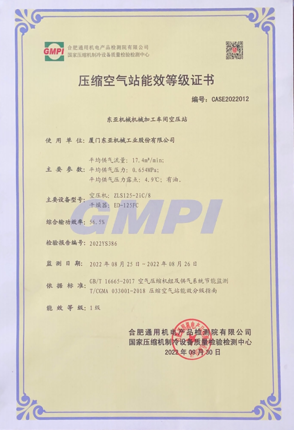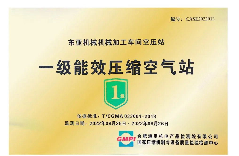 近日,東亞機械機械加工車間空壓站獲“一級能效壓縮空氣站”掛牌認(rèn)定。?
