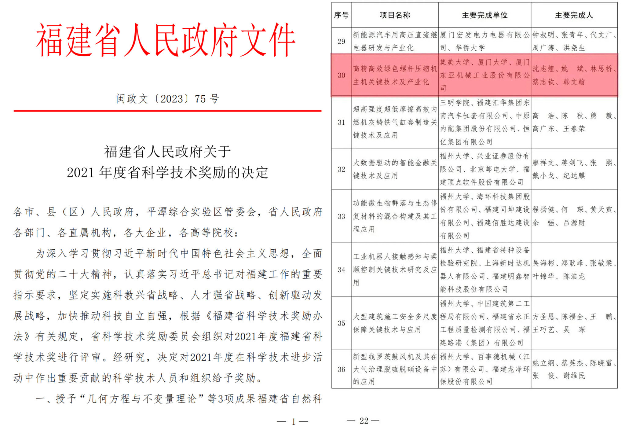 近日,福建省人民政府印發(fā)《省政府關(guān)于2021年度福建省科學(xué)技術(shù)獎(jiǎng)勵(lì)的決定》,正式公布2021年度福建省科學(xué)技術(shù)獎(jiǎng)評(píng)獎(jiǎng)結(jié)果。廈門(mén)東亞機(jī)械再次榮膺上榜。由廈門(mén)東亞機(jī)械工業(yè)股份有限公司、廈門(mén)大學(xué)、集美大學(xué)共同合作研究設(shè)計(jì)的《高精高效綠色螺桿壓縮機(jī)主機(jī)關(guān)鍵技術(shù)及產(chǎn)業(yè)化》榮獲2021福建省科學(xué)技術(shù)進(jìn)步獎(jiǎng)!
