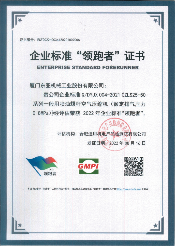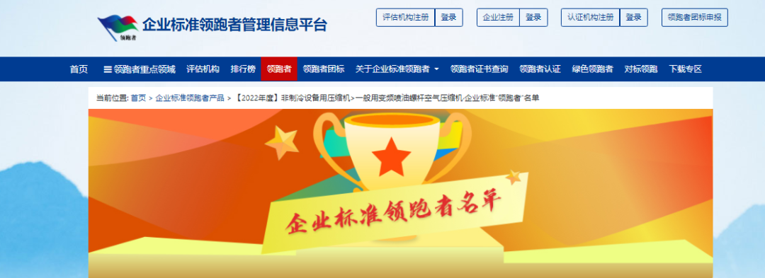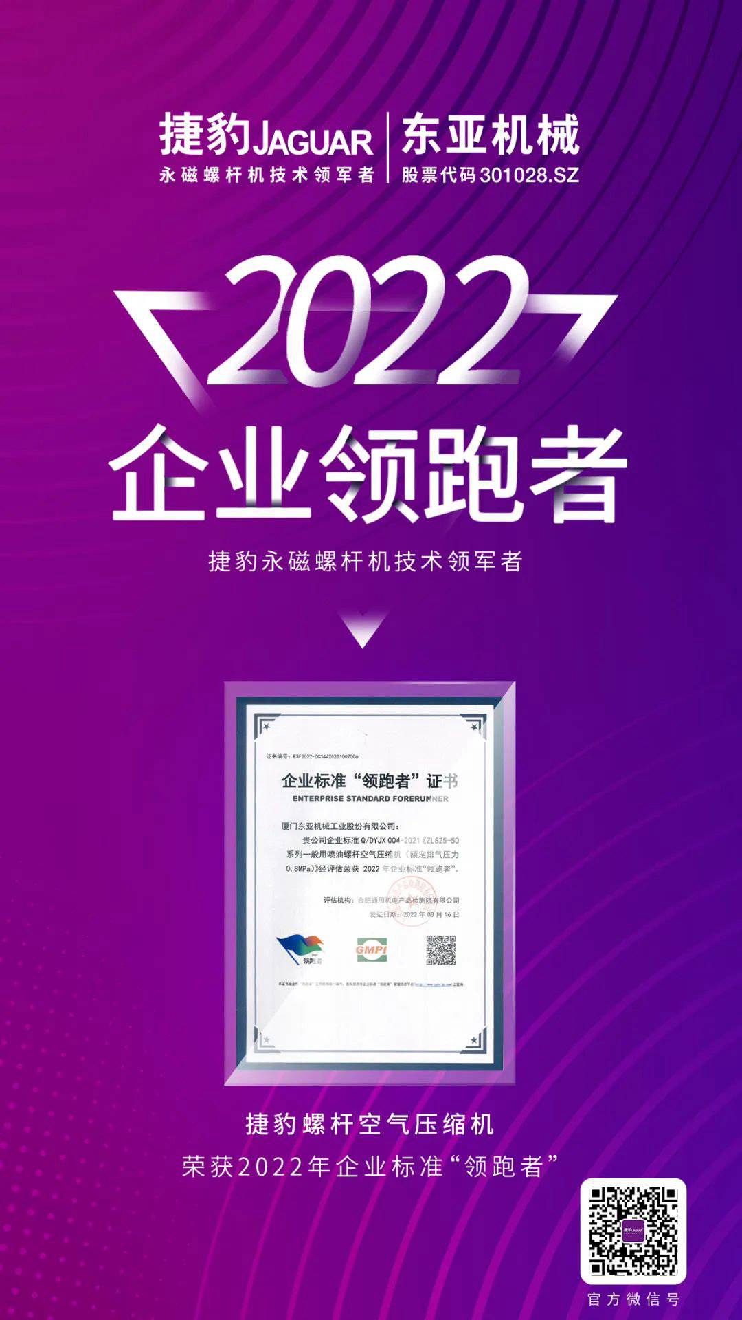 捷豹空壓機(jī),2020年——2022年連續(xù)三年榮膺上榜企業(yè)標(biāo)準(zhǔn)“領(lǐng)跑者”,彰顯了捷豹空壓機(jī)在行業(yè)領(lǐng)域內(nèi)的先進(jìn)性、創(chuàng)新性。