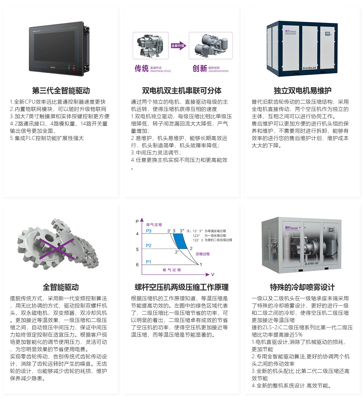 捷豹永磁螺桿機(jī)第三代全智能驅(qū)動(dòng); 雙電機(jī)雙主機(jī)串聯(lián)可分體; 獨(dú)立雙點(diǎn)機(jī)易維護(hù); 全智能驅(qū)動(dòng); 螺旋看空壓機(jī)兩級(jí)壓縮; 特殊的冷卻噴霧設(shè)計(jì)