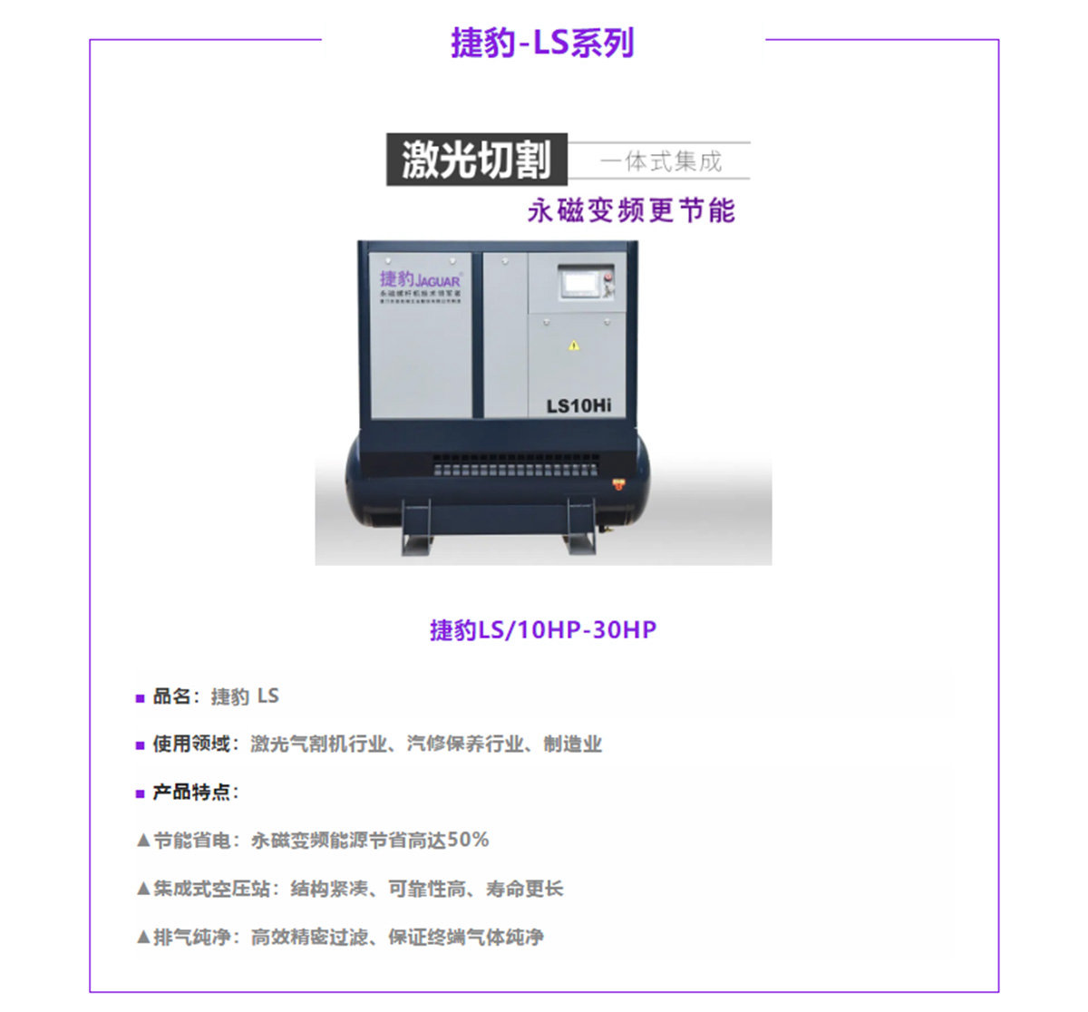 捷豹永磁螺桿機全新一代外觀設(shè)計,全新結(jié)構(gòu),品質(zhì)穩(wěn)定 采用同軸傳動方式,傳動效率更高,零傳動效率損耗 采用IE4永磁變頻電機,根據(jù)客戶需求自由變化轉(zhuǎn)速 全密封液冷式電機殼體,IP65防護系數(shù)