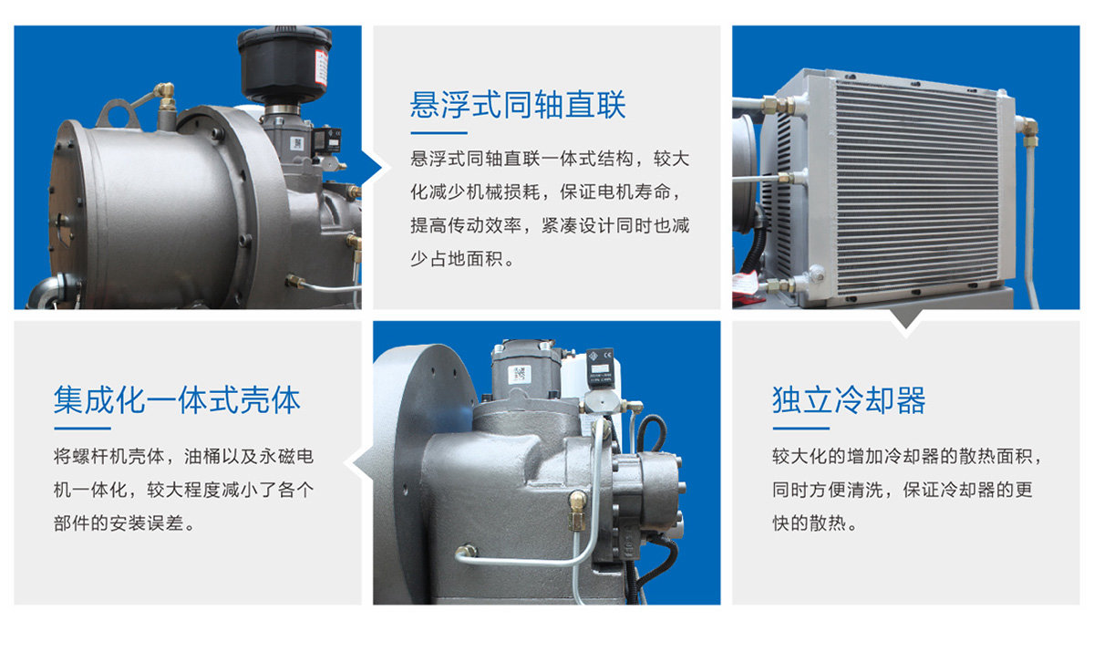 集成化一體式,空間極其小: 全新集成化一體式永磁變頻螺桿機,螺桿主機、油氣桶、永磁電機三者全集成,高效節(jié)能,完全消除空氣壓縮過程當中產(chǎn)生的所有阻力。
